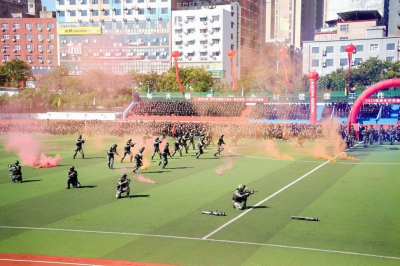 接著,在嘹亮的進行曲中,隊列式表演開始,全體新生精神抖擻、英姿颯爽地邁著正步走過主席臺,展現(xiàn)出新時代青年的蓬勃朝氣與堅毅風采。各方陣以挺拔的軍姿、激昂的口號、整齊的隊列,展現(xiàn)了升達學子斗志昂揚的精神風貌。他們的演示鏗鏘有力、凌厲有度,充分展示了軍訓取得的成果,贏得現(xiàn)場陣陣掌聲。全體新生還集體背誦了升達校訓、升達精神和升達格言。