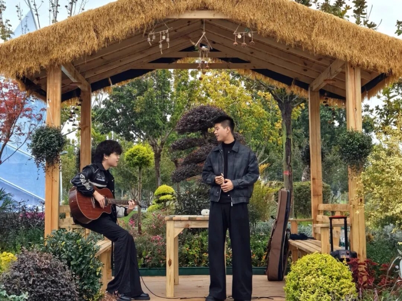 在伊川花境的古樸草亭下,24級音樂表演班范家福、劉晨的雙人吉他彈唱以清新悅耳的曲風(fēng),與花境的寧靜爛漫相得益彰