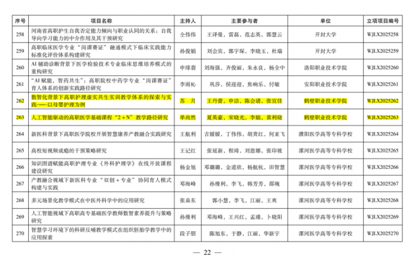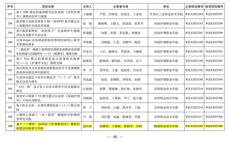 根據(jù)《河南省衛(wèi)生健康委員會(huì)關(guān)于公布2025年河南省醫(yī)學(xué)教育研究項(xiàng)目立項(xiàng)和結(jié)項(xiàng)名單的通知》(豫衛(wèi)科教函〔2025〕21號(hào)),鶴壁職業(yè)技術(shù)學(xué)院申報(bào)的3個(gè)醫(yī)學(xué)教育研究項(xiàng)目順利通過(guò)結(jié)項(xiàng)驗(yàn)收,同時(shí)成功立項(xiàng)2025年河南省醫(yī)學(xué)教育研究項(xiàng)目2個(gè),立項(xiàng)數(shù)量在省內(nèi)同類(lèi)職業(yè)院校中位于前列。