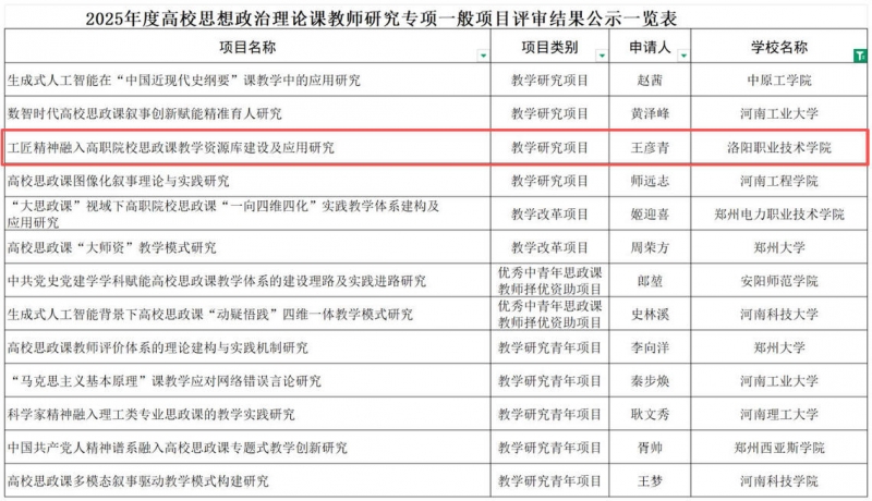 近日,教育部社會(huì)科學(xué)司公布了2025年度高校思想政治理論課教師研究專項(xiàng)一般項(xiàng)目評(píng)審結(jié)果。學(xué)校項(xiàng)目“工匠精神融入高職院校思政課教學(xué)資源庫(kù)建設(shè)及應(yīng)用研究”成功入選一般項(xiàng)目類別,成為全省高職院校唯一入選項(xiàng)目。