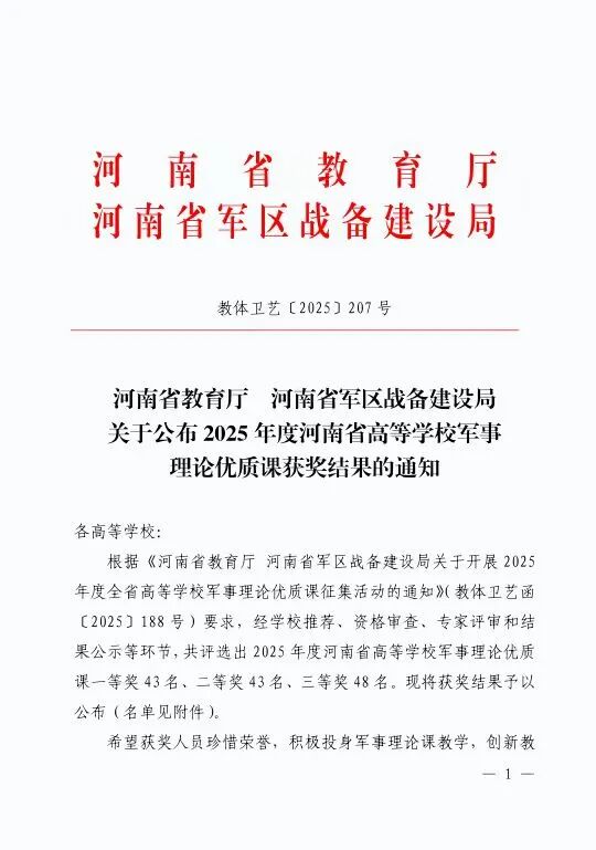 近日,河南省教育廳、河南省軍區(qū)戰(zhàn)備建設(shè)局公布了2025年度全省高等學(xué)校軍事理論優(yōu)質(zhì)課獲獎(jiǎng)名單,開(kāi)封大學(xué)信息工程學(xué)院教師李潔講授的課例《鑄造護(hù)國(guó)利劍開(kāi)創(chuàng)強(qiáng)軍偉業(yè)——國(guó)防建設(shè)(二)》榮獲一等獎(jiǎng)。