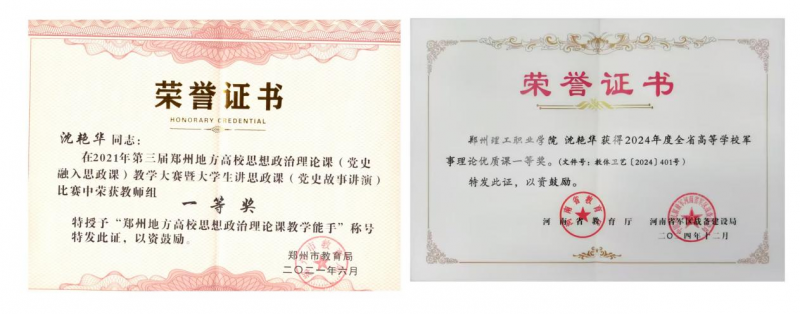 2021年她參加第三屆鄭州市地方高校思想政治理論課教學(xué)能力大賽獲得一等獎并被授予“鄭州地方高校思想政治理論課教學(xué)能手”榮譽(yù)稱號;她主講的《軍事理論》獲評校級“優(yōu)質(zhì)課程”,2024年備戰(zhàn)省級軍事理論優(yōu)質(zhì)課比賽期間,她反復(fù)打磨教學(xué)設(shè)計(jì)至凌晨,與學(xué)生反復(fù)溝通,不放過任何細(xì)節(jié),克服視頻錄制技術(shù)支持不足的困難,最終憑借生動的國防案例、沉浸式教學(xué)環(huán)節(jié)斬獲河南省高等學(xué)校軍事理論優(yōu)質(zhì)課一等獎。