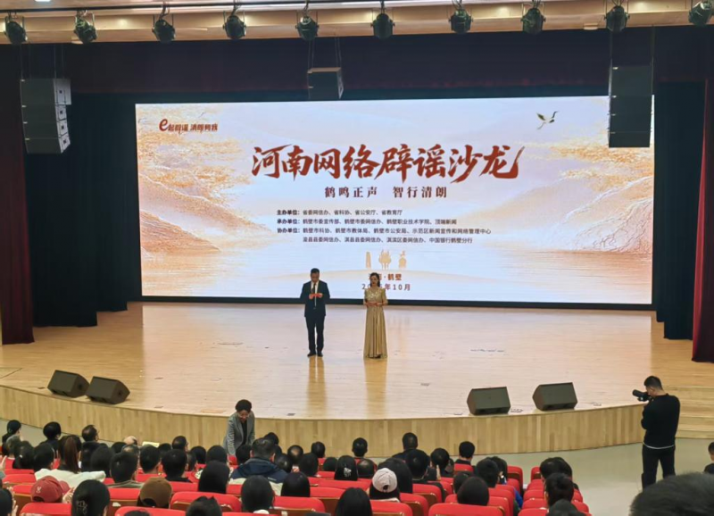 10月10日上午,河南省“e起辟謠 清朗有我”網(wǎng)絡辟謠沙龍(第三季)在鶴壁職業(yè)技術學院誠信禮堂舉辦。河南省委網(wǎng)信辦副主任李麗,鶴壁市委常委、宣傳部部長邵七一出席活動并致辭。省科協(xié)黨組成員、副主席郝立新,省教育廳黨組成員、副廳長張國強,鶴壁職業(yè)技術學院黨委書記蔡太生出席活動,各地網(wǎng)信辦、鶴壁市相關部門負責同志,有關網(wǎng)絡媒體記者及學校師生代表300余人參加活動。