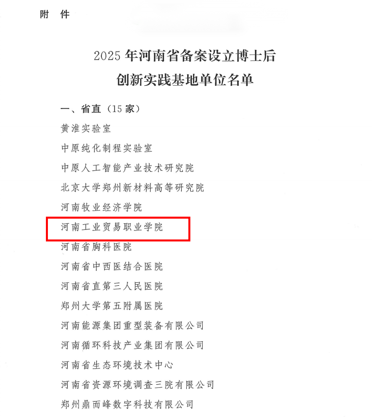 近日,河南省人力資源和社會保障廳公布2025年河南省備案設(shè)立博士后創(chuàng)新實踐基地單位名單,河南工業(yè)貿(mào)易職業(yè)學院憑借在人才培育、科研攻關(guān)與產(chǎn)教融合領(lǐng)域的扎實積累成功入選。這一成果既是河南省人力資源和社會保障廳對學校高層次人才工作與辦學實力的高度認可,更是學校踐行“服務糧食安全、賦能商貿(mào)發(fā)展”辦學使命,推進“人才強校、科研興校”戰(zhàn)略的重要里程碑,標志著學校在高層次人才“引、育、用、服”全鏈條建設(shè)與科技創(chuàng)新平臺發(fā)展上邁入新階段。