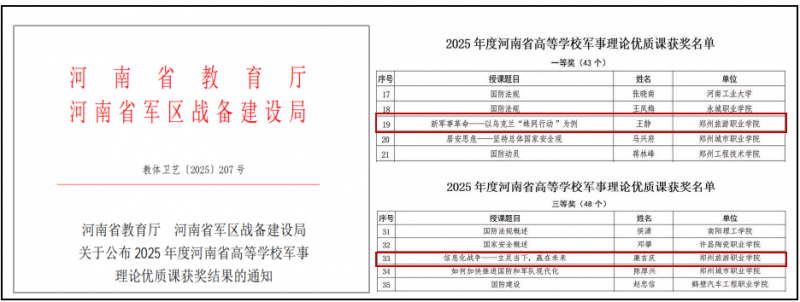 近日,河南省教育廳、河南省軍區(qū)戰(zhàn)備建設(shè)局聯(lián)合公布了2025年度河南省高等學(xué)校軍事理論優(yōu)質(zhì)課評(píng)選結(jié)果。在此次比賽中,鄭州旅游職業(yè)學(xué)院馬克思主義學(xué)院王靜老師收獲一等獎(jiǎng),廉吉慶老師榮獲三等獎(jiǎng),展現(xiàn)了學(xué)校教師在軍事理論教學(xué)領(lǐng)域的扎實(shí)功底與卓越風(fēng)采。