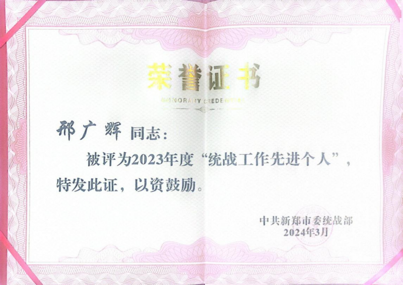 2023年9月,擔(dān)任校黨委統(tǒng)戰(zhàn)部副部長(zhǎng)后,邢廣輝重點(diǎn)將“鑄牢中華民族共同體意識(shí)”融入工作每一環(huán)。他深知,高校是民族團(tuán)結(jié)進(jìn)步教育的重要陣地,為此,他牽頭制定《鄭州理工職業(yè)學(xué)院民族團(tuán)結(jié)進(jìn)步教育實(shí)施方案》,策劃開(kāi)展“中華民族一家親”系列活動(dòng)——組織舉辦“黨委書(shū)記講統(tǒng)戰(zhàn),統(tǒng)戰(zhàn)部長(zhǎng)講民族宗教”系列講座;邀請(qǐng)領(lǐng)導(dǎo)專家為師生解讀民族政策;舉辦“中華民族一家親,同心共筑中國(guó)夢(mèng)”主題演講比賽;開(kāi)展“鑄牢中華民族共同體意識(shí)”課程思政教學(xué)研討會(huì)。同時(shí)依托新鄭市獨(dú)有的黃帝故里文化、裴李崗文化,以探尋華夏歷史文脈為契機(jī)大力開(kāi)展民族團(tuán)結(jié)進(jìn)步教育特色活動(dòng)。這些活動(dòng)累計(jì)覆蓋全校20000余名師生,有效增進(jìn)了各民族師生的交流交融。在他的努力推動(dòng)下,學(xué)校獲評(píng)“新鄭市統(tǒng)戰(zhàn)工作先進(jìn)單位”,其本人也被授予“新鄭市統(tǒng)戰(zhàn)工作先進(jìn)個(gè)人”稱號(hào)。