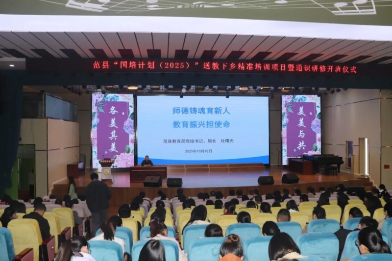 10月18日,范縣2025年“國(guó)培計(jì)劃”送教下鄉(xiāng)精準(zhǔn)培訓(xùn)開(kāi)班儀式暨通識(shí)培訓(xùn)在范縣第三小學(xué)舉行。該縣縣教育局黨組書記、局長(zhǎng)杜曙光出席并致辭,縣教育局、縣教師發(fā)展中心相關(guān)負(fù)責(zé)人,各基地學(xué)校校長(zhǎng)、專家團(tuán)隊(duì)、管理團(tuán)隊(duì)及參訓(xùn)學(xué)員等500余人參加。