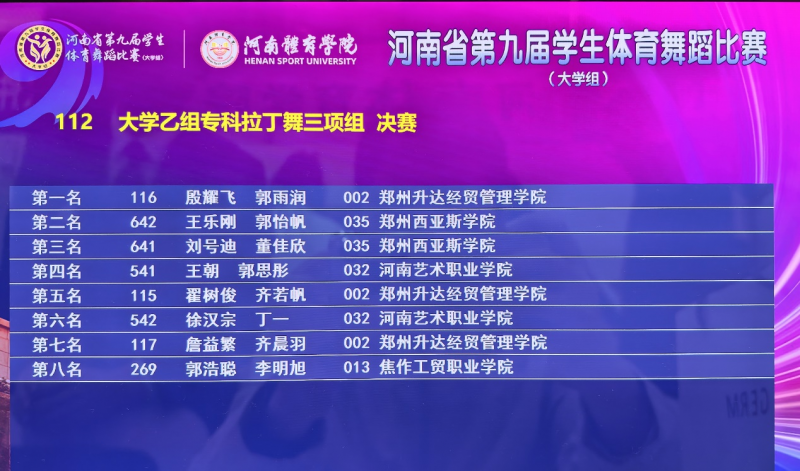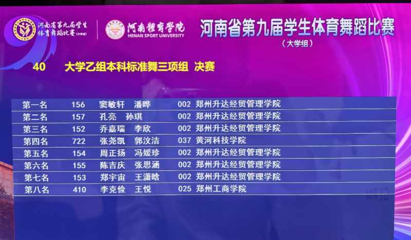 10月17-18日,由河南省教育廳、河南省體育局主辦的河南省第九屆學(xué)生體育舞蹈比賽在河南體育學(xué)院隆重舉行。來自全省的43支代表隊,900余名運動員參加本次大賽。鄭州升達(dá)經(jīng)貿(mào)管理學(xué)院體育舞蹈代表隊取得了10項第一名,19項第二名,14項第三名的佳績,并獲得本次比賽的體育道德風(fēng)尚獎。