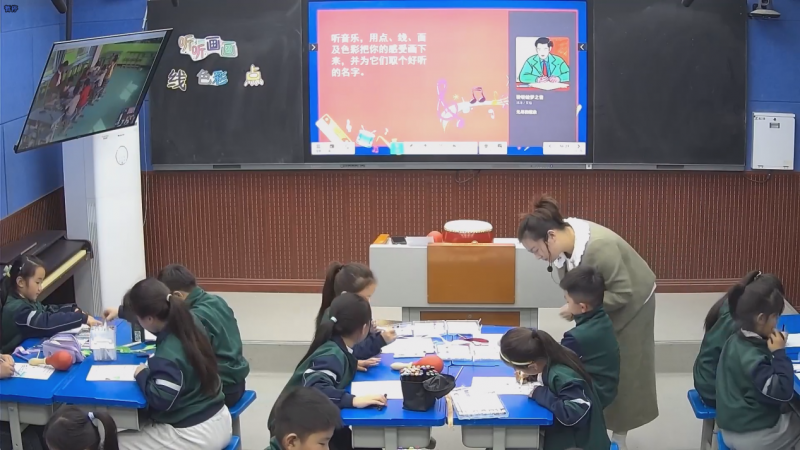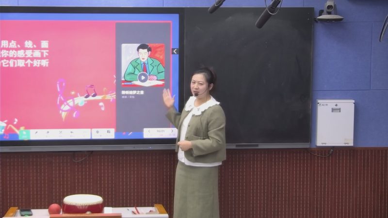 創(chuàng)作時刻,《森林狂想曲》的韻律在教室流淌,兩所學(xué)校的孩子們用點、線、面編織著心中的音畫交響。分享環(huán)節(jié),韋老師分別邀請兩校學(xué)生介紹“畫的是什么聲音”“用了哪些線條色彩”“為什么這樣畫”,強化了表達與審美交流。