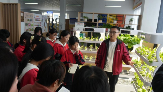 啟動儀式后,多功能電教室變身為“現(xiàn)代農(nóng)業(yè)技術課堂”。肖懷娟通過PPT展示水培蔬菜種植場景,拆解“智能種菜機光照設置”“營養(yǎng)液1:500精準配比”等技術。七年級學生張夢語提問家庭生菜爛根問題,肖懷娟結合水培原理解答,并邀請她課后到“五育”實踐空間實操。“這樣的互動讓知識不懸空,能幫孩子養(yǎng)成動手探究習慣,正是‘五育’融合的意義。”肖懷娟補充道。