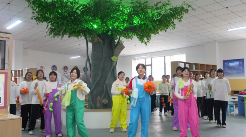 在“五育”實踐空間的脫玉米競賽中,民權縣叁收種苗有限公司贊助的豫東本地玉米鋪滿賽場,七、八年級學生分組參賽,評委既看速度,更查是否拋灑玉米粒……依托“五育”實踐空間,學校還開展了與糧食、勞動有關的藝術創(chuàng)作社團活動。