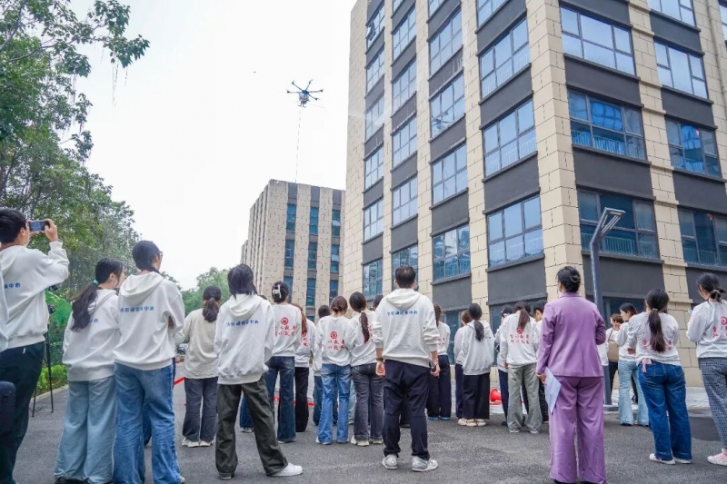 在恒生科技園,同學們現(xiàn)場觀看了中曌遙感科技有限公司智能清洗無人機高空作業(yè)。伴隨著陣陣風浪,無人機騰空而起,噴出一道道泡沫水柱清洗著大樓外墻的玻璃。同學們不僅被先進科技賦能服務(wù)行業(yè)的場景所震撼,也被中曌遙感團隊用代碼編寫“空中交通規(guī)則”,為物流、測繪、應(yīng)急救援插上翅膀的故事所激勵。