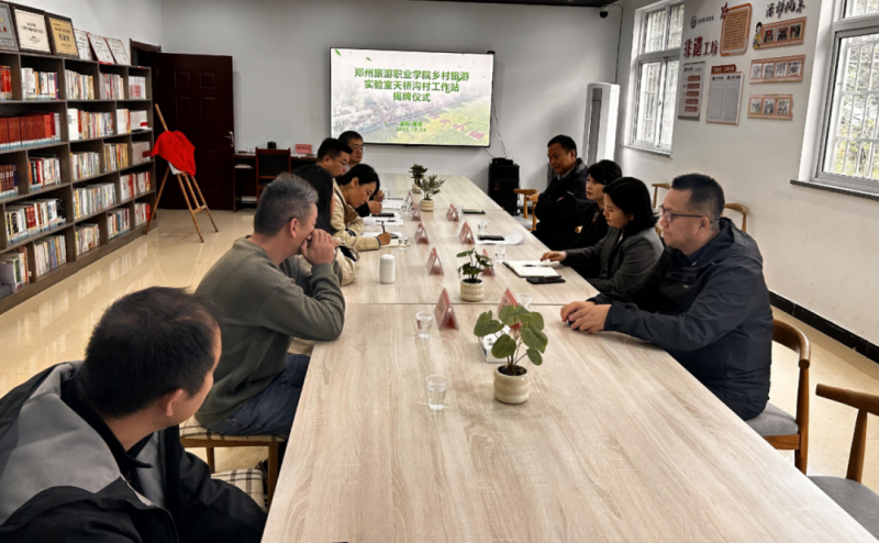 王艷紅在致辭中介紹了學校在鄉(xiāng)村旅游領域的人才培養(yǎng)、產(chǎn)業(yè)研究與規(guī)劃設計的資源優(yōu)勢。她指出,天橋溝村生態(tài)優(yōu)良、文化底蘊深厚,具有發(fā)展鄉(xiāng)村旅游的良好基礎。她強調(diào),學校作為河南省文旅人才培養(yǎng)的重要基地,始終以服務地方發(fā)展為使命,將以工作站為平臺,遵循“政府引導、高校支撐、村企聯(lián)動、精準幫扶”原則,推動“產(chǎn)學研用”深度融合,助力天橋溝村走出一條文旅興村的特色振興之路。 吳瓊瓊對鄭州旅游職業(yè)學院的支持表示感謝,并介紹了天橋溝村作為全國鄉(xiāng)村旅游重點村、河南省5A康養(yǎng)旅游示范村等多項榮譽的發(fā)展現(xiàn)狀。她指出,當前天橋溝村在鄉(xiāng)村旅游發(fā)展中仍面臨專業(yè)人才不足、發(fā)展模式有待優(yōu)化等問題,希望以工作站為契機,借助高校智力資源推動產(chǎn)業(yè)提質(zhì)升級,為嵩縣鄉(xiāng)村旅游注入新動能。 隨后,王艷紅與吳瓊瓊共同為“河南鄉(xiāng)村旅游實驗室——天橋溝村工作站”揭牌。 儀式結束后,與會人員在天橋溝村負責人陪同下,實地調(diào)研了該村民宿集群、非遺文化展示點與旅游服務中心,深入了解文旅產(chǎn)業(yè)發(fā)展情況。 工作站的設立是鄭州旅游職業(yè)學院深化產(chǎn)教融合、服務區(qū)域發(fā)展的又一重要舉措。下一步,校地雙方將以工作站為紐帶,整合資源、協(xié)同發(fā)力,推動黨支部聯(lián)建與“黨建引領、五鏈融合”人才培養(yǎng)模式落地,以黨建鏈串聯(lián)產(chǎn)業(yè)鏈、服務鏈、人才鏈與創(chuàng)新鏈,全面提升鄉(xiāng)村旅游服務能級與人才支撐水平,為鄉(xiāng)村振興持續(xù)賦能。