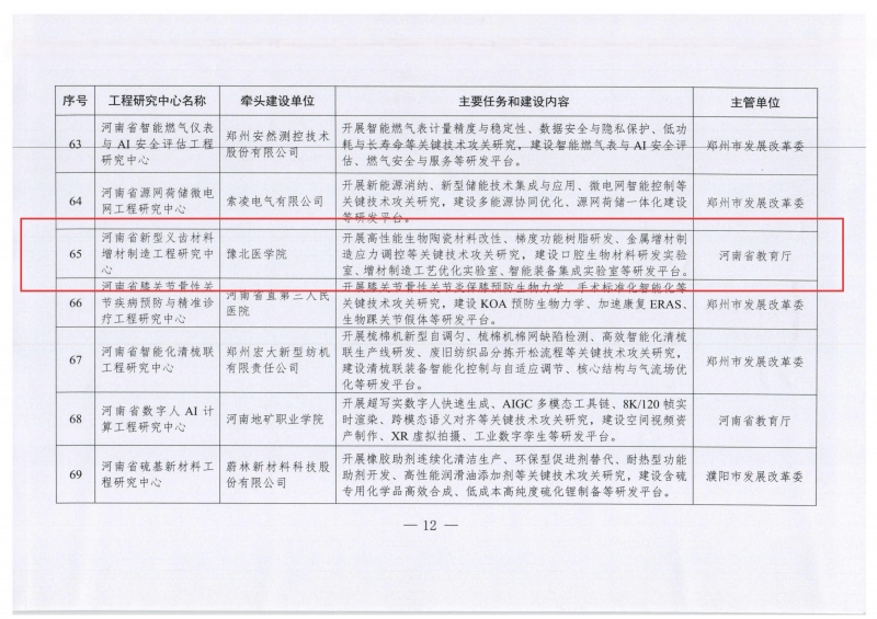近日,河南省發(fā)展和改革委員會發(fā)布了《關于河南省材料智能設計與智能制造工程研究中心等140個省工程研究中心的批復》〔豫發(fā)改高技〔2025〕724號〕文件。由豫北醫(yī)學院牽頭與企業(yè)聯(lián)合申報的“河南省新型義齒材料增材制造工程研究中心”成功獲批。