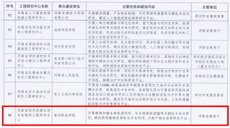 近日,河南省發(fā)展和改革委員會(huì)發(fā)布了《關(guān)于河南省材料智能設(shè)計(jì)與智能制造工程研究中心等140個(gè)省工程研究中心的批復(fù)》(豫發(fā)改高技〔2025〕724號(hào))文件,由黃河科技學(xué)院牽頭申報(bào)的“河南省藥用資源化學(xué)與生物學(xué)工程研究中心”成功獲批。該中心是學(xué)校由河南省發(fā)展和改革委員會(huì)批準(zhǔn)建設(shè)的第二個(gè)省級(jí)工程研究中心。