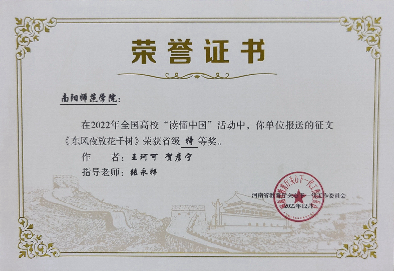 深化“讀懂中國”活動,繼往開來續(xù)新篇。學(xué)校關(guān)工委落實教育部“讀懂中國”活動要求,精心組織、廣泛宣傳、深入挖掘,遴選“五老”典型與學(xué)生訪談,收評推薦優(yōu)秀征文及短視頻。2021—2023年推薦到省教育廳關(guān)工委的作品全部獲獎,其中征文獲特等獎3項、一等獎8項、二等獎3項、三等獎1項,微視頻獲特等獎5項、一等獎3項、二等獎1項;2022—2023年連續(xù)獲得“優(yōu)秀組織獎”;獲評2023年教育部“讀懂中國”活動表揚單位。