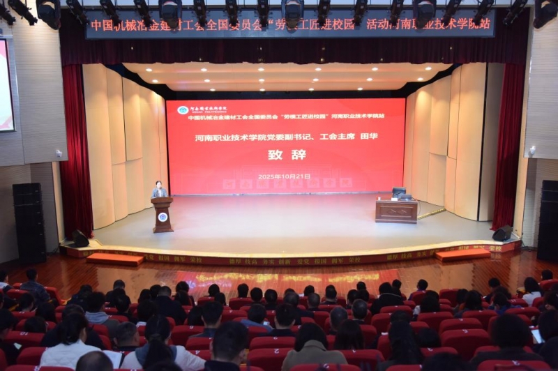 10月21日下午,河南職業(yè)技術(shù)學(xué)院在音樂廳舉行“勞模工匠進(jìn)校園”暨“匠心大講堂”報(bào)告會(huì)。全國(guó)勞動(dòng)模范、中國(guó)一重集團(tuán)有限公司重型裝備事業(yè)部桂玉松,全國(guó)勞動(dòng)模范、方大特鋼科技股份有限公司甘榮剛應(yīng)邀作專題報(bào)告。中國(guó)機(jī)械冶金建材工會(huì)副主席張杰、冶金工作部部長(zhǎng)王欣,有色金屬工業(yè)人才中心主任助理趙麗霞,河南省機(jī)械冶金建材工會(huì)主席呂慶,河南省教科文衛(wèi)體工會(huì)二級(jí)調(diào)研員李陶營(yíng);校黨委副書記、工會(huì)主席田華,校黨委委員、副校長(zhǎng)朱永寬,學(xué)校相關(guān)單位師生代表參加報(bào)告會(huì)。