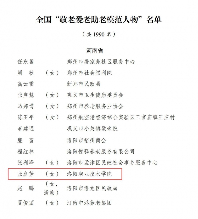 近日,民政部全國老齡工作委員會辦公室公布了全國“敬老文明號”、全國“敬老愛老助老模范人物”名單,洛陽職業(yè)技術(shù)學(xué)院護(hù)理與康養(yǎng)學(xué)院院長張彥芳榮獲全國“敬老愛老助老模范人物”稱號。