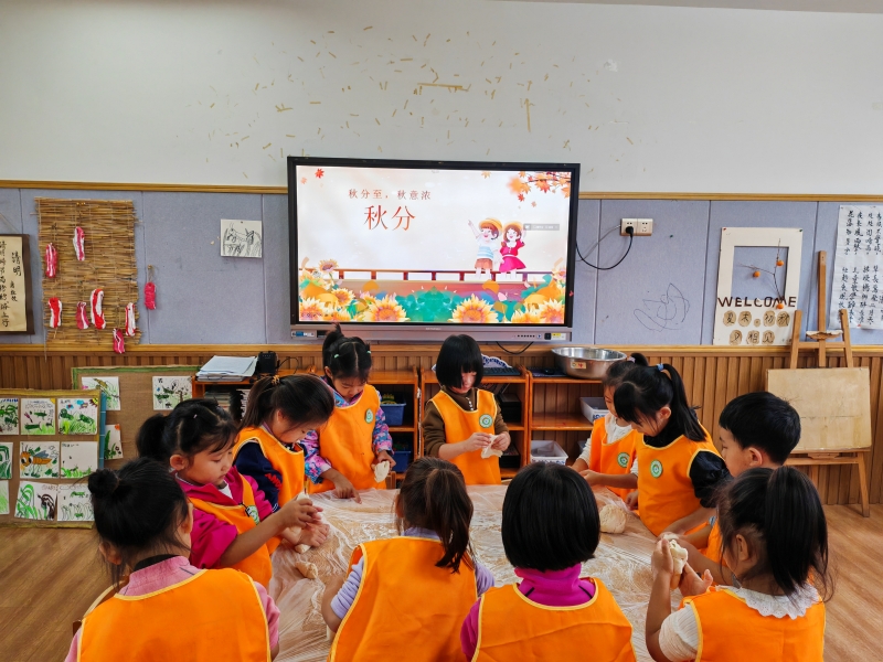 秋分時節(jié),一群系著橙色圍裙的孩子們圍坐桌前,在老師的指導下揉面團、填秋菜餡,將豐收的滋味仔細包進柔軟面皮中。孩子們在親手制作中,體驗“秋分食秋菜”的傳統(tǒng)習俗,感知“秋藏豐收”的節(jié)氣內(nèi)涵。