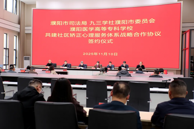 2025年11月10日,濮陽市司法局、九三學(xué)社濮陽市委員會、濮陽醫(yī)學(xué)高等專科學(xué)校三方戰(zhàn)略合作簽約儀式在華龍區(qū)司法局成功舉行,標(biāo)志著我市社區(qū)矯正心理服務(wù)體系共建工作正式啟動。此次跨部門、跨領(lǐng)域的強(qiáng)強(qiáng)聯(lián)合,旨在為社區(qū)矯正對象構(gòu)建一道堅(jiān)實(shí)的“心理防線”,助力其重塑健康心態(tài)、順利回歸社會,是濮陽醫(yī)專深化校地合作、履行社會責(zé)任的重要實(shí)踐。