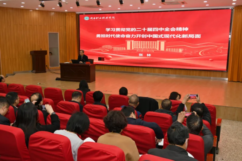 為深入學(xué)習(xí)貫徹黨的二十屆四中全會精神,引導(dǎo)全體中層以上領(lǐng)導(dǎo)干部統(tǒng)一思想、凝聚共識,將會議精神轉(zhuǎn)化為推動學(xué)校事業(yè)發(fā)展的強大動力,11月18日下午,新鄉(xiāng)職業(yè)技術(shù)學(xué)院在實驗樓一樓階梯教室召開黨委理論學(xué)習(xí)中心組(擴大)學(xué)習(xí)會議。學(xué)校黨委中心組成員及全體中層以上領(lǐng)導(dǎo)干部參加了學(xué)習(xí)。會議由黨委委員、副校長原淑慧主持。
