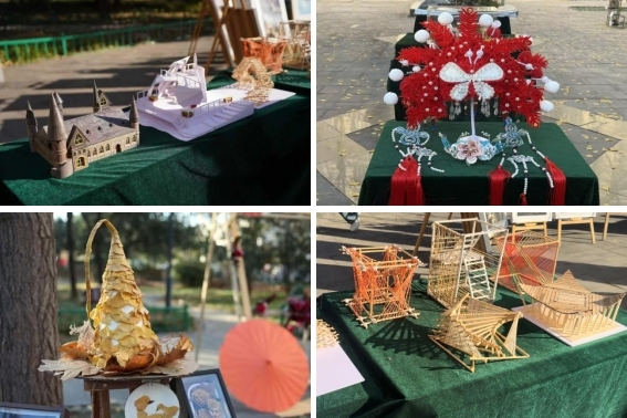本次活動(dòng)由藝術(shù)觀賞區(qū)和互動(dòng)體驗(yàn)區(qū)組成。在藝術(shù)觀賞區(qū),學(xué)院師生以銀杏葉、果實(shí)等可持續(xù)材料為素材,制作了銀杏帽、風(fēng)鈴、虎頭等手工藝品和產(chǎn)品材料與工藝、植物景觀等課程實(shí)踐成果。學(xué)院教授、中國女畫家協(xié)會(huì)會(huì)員、河南省美術(shù)家協(xié)會(huì)會(huì)員徐艷秋老師和學(xué)院副教授、河南美術(shù)家協(xié)會(huì)會(huì)員郭璐妍老師的《花卉靜物》《布道者》《逝》《夏天的魚》等獲獎(jiǎng)作品在學(xué)校活動(dòng)中展示,受到了師生廣泛關(guān)注和一致贊賞。學(xué)院副教授、中國書法家協(xié)會(huì)會(huì)員、河南省書法家協(xié)會(huì)教育委員會(huì)委員杜旭光老師和副教授、河南省美術(shù)家協(xié)會(huì)會(huì)員、河南省國畫家協(xié)會(huì)會(huì)員寧傳華老師更是現(xiàn)場用筆、墨、紙、硯書寫、繪畫出一幅幅意蘊(yùn)悠長的紅葉主題畫卷,將本次活動(dòng)推向高潮。悄然中,學(xué)生的手工作品《扇間秋韻》杏葉秋弦》《葉里的小世界》《寫給秋天的一封信》等在金色秋風(fēng)中綻放,點(diǎn)綴著枝頭的秋光的明媚與創(chuàng)作的鮮活,把觀眾引入了輕盈又治愈的秋日夢境中。學(xué)院教授孟濱老師和副教授王娜老師分別為與會(huì)領(lǐng)導(dǎo)介紹了現(xiàn)場展示作品的內(nèi)涵及制作工藝。一件件作品精巧細(xì)致、立意深遠(yuǎn)、意蘊(yùn)悠長,充分展現(xiàn)了兩院師生深厚的藝術(shù)素養(yǎng)、扎實(shí)的專業(yè)功底、靈巧的手工技藝、豐富的想象力和學(xué)校深耕課程育人的實(shí)踐成效。在互動(dòng)體驗(yàn)區(qū),我們給參與師生準(zhǔn)備了投壺、漆扇、滴膠、集葉等豐富多彩的非遺體驗(yàn)活動(dòng)。