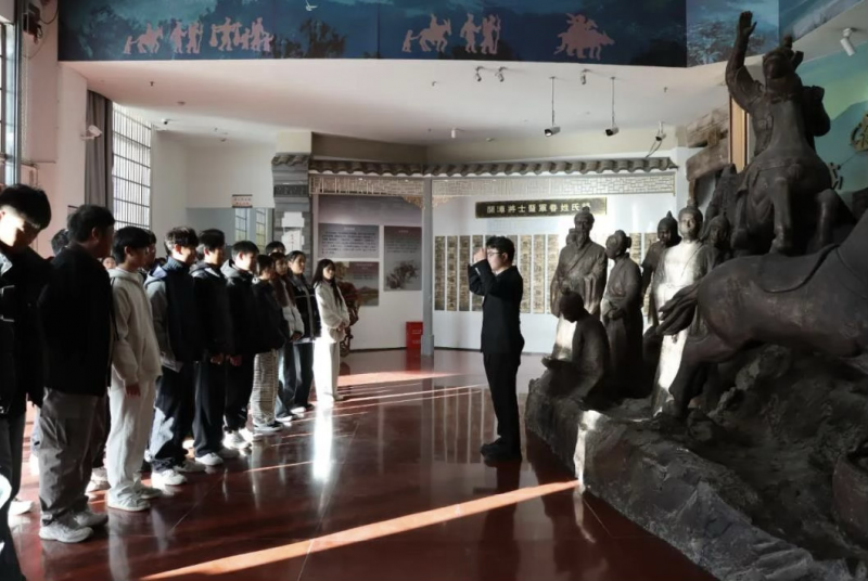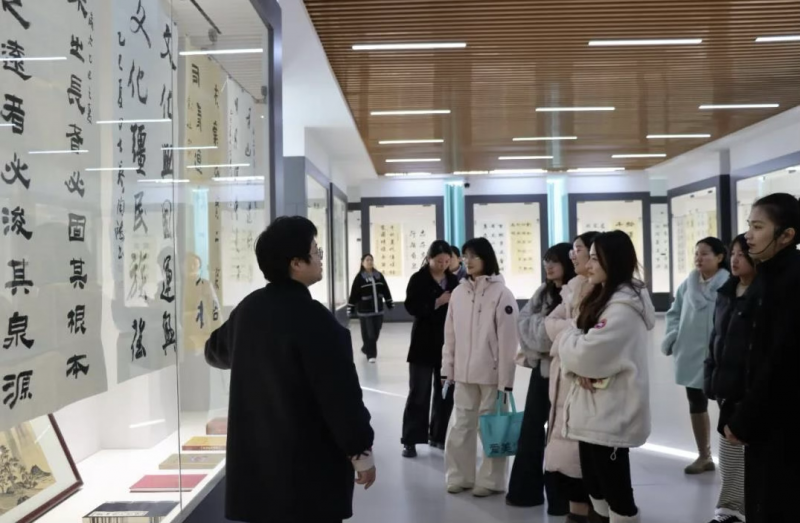 儀式結(jié)束后,學(xué)校師生在講解員的引導(dǎo)下,參觀了博物館常設(shè)展覽及“根親族譜書(shū)畫(huà)展”。馬克思主義學(xué)院青年教師朱良晨以展廳為課堂,以館內(nèi)歷史文物、雕塑為教具,開(kāi)展了一場(chǎng)別開(kāi)生面的現(xiàn)場(chǎng)教學(xué)。他圍繞根親文化與民族認(rèn)同主題,生動(dòng)講述了1300多年前固始先民南遷、繁衍發(fā)展的歷史,闡釋了固始作為閩臺(tái)同胞和海外僑胞祖地的深厚淵源,引導(dǎo)學(xué)生深刻理解中華文化的連續(xù)性與中華民族共同體意識(shí)。“以前覺(jué)得思政理論很抽象,現(xiàn)在通過(guò)觸摸文物、聆聽(tīng)歷史,真切感受到了民族文化的厚重和家國(guó)情懷的力量。” 參與活動(dòng)的學(xué)生紛紛表示,這種沉浸式、行走式的教學(xué)模式,讓深刻的思想變得生動(dòng)鮮活,進(jìn)一步深化了對(duì)鑄牢中華民族共同體意識(shí)的認(rèn)識(shí)。