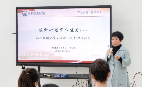 11月19日,河南地礦職業(yè)學(xué)院關(guān)工委聯(lián)合多部門舉辦“心靈花園,‘育’見未來(lái)”主題心理活動(dòng)。該活動(dòng)由測(cè)繪工程學(xué)院“繪心筑夢(mèng)”心理培育輔導(dǎo)員工作室承辦,特邀河南經(jīng)貿(mào)職業(yè)學(xué)院樊紅燕教授主講。校長(zhǎng)劉玉賓、副校長(zhǎng)張霖出席活動(dòng),多部門負(fù)責(zé)人、各學(xué)院團(tuán)總支書記及心理專員參加活動(dòng)。