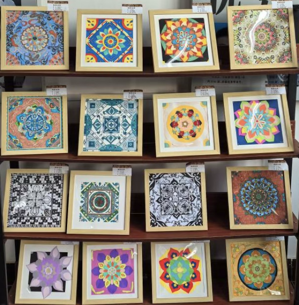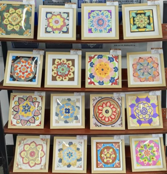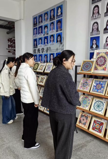 一幅幅精心裝裱的作品整齊陳列,色彩明快、風(fēng)格各異的紋樣相互交織,營(yíng)造出濃厚的藝術(shù)氛圍。觀展師生不時(shí)駐足,或細(xì)細(xì)品味紋樣中蘊(yùn)含的文化細(xì)節(jié),或輕聲交流對(duì)作品的理解與感受。同學(xué)們紛紛表示,通過(guò)觀賞這些作品,不僅感受到了敦煌紋樣的藝術(shù)魅力,更對(duì)中華優(yōu)秀傳統(tǒng)文化產(chǎn)生了濃厚的興趣。而親身參與創(chuàng)作的學(xué)生則表示,此次創(chuàng)作經(jīng)歷讓自己深入觸摸到了傳統(tǒng)藝術(shù)的精髓,既提升了自身的藝術(shù)設(shè)計(jì)能力,也增強(qiáng)了文化自信與傳承意識(shí)。