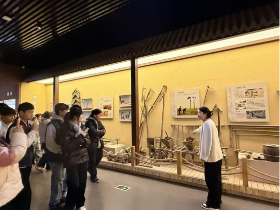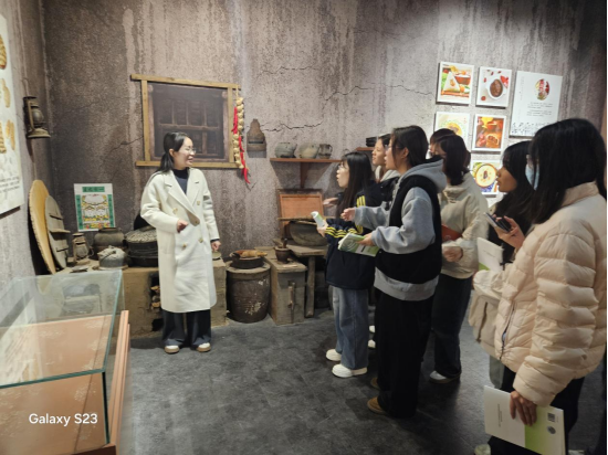 “孟莊是‘中國紅棗之鄉(xiāng)’,館內(nèi)陳列的老紡車、棗筐都是當(dāng)年棗農(nóng)生產(chǎn)生活的見證。”講解老師結(jié)合詳實(shí)史料與鮮活故事,為同學(xué)們細(xì)致解讀每一件展品背后的文化內(nèi)涵。同學(xué)們駐足聆聽,不時拿出手機(jī)拍照記錄,或圍繞展品與同伴交流感悟,在視覺與聽覺的雙重沖擊中,真切感受到了勞動人民的智慧與民俗文化的魅力。