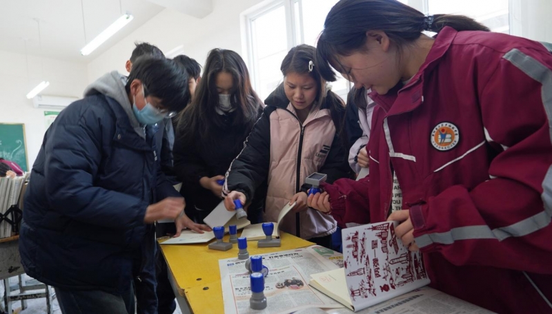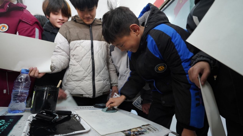 為增強(qiáng)體驗(yàn)感與參與度,活動(dòng)特別設(shè)置了藝術(shù)實(shí)踐環(huán)節(jié)——“兩彈一星”紅色人物版畫(huà)拓印體驗(yàn)。在志愿者的指導(dǎo)下,學(xué)生們親手將刻有鄧稼先、錢(qián)學(xué)森、于敏等功勛人物形象的模板拓印于紙上。這一過(guò)程不僅讓學(xué)生們體驗(yàn)了傳統(tǒng)拓印工藝,更通過(guò)近距離的觀察,深入了解每位紅色人物背后的動(dòng)人故事,對(duì)“兩彈一星”精神有了更為具象和深刻的感悟。
