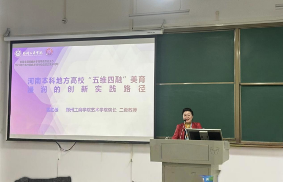 會上,鄭州工商學院藝術學院院長雷紅薇教授以《河南本科地方高校“五維四融”美育浸潤創(chuàng)新實踐路徑》為題作地方高校美育浸潤行動經驗與成效交流分享論壇報告。報告立足教育部美育浸潤八項任務,以“課程、文化、實踐、評價、資源”五維協(xié)同為框架,通過“融課程、融實踐、融文化、融社會”四融路徑,構建全方位、立體化浸潤式美育體系,將美育深度融入人才培養(yǎng)全過程,打造可復制、可推廣的河南高校美育樣板,獲參會嘉賓廣泛認可。