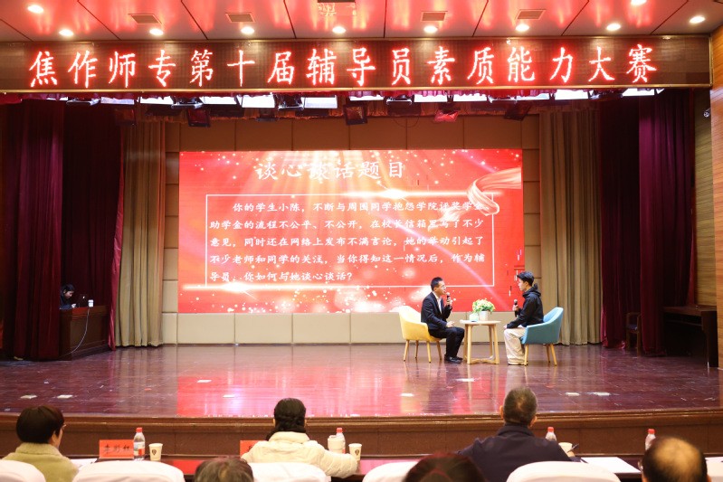 12月8日下午,焦作師范高等專科學(xué)校第十屆輔導(dǎo)員素質(zhì)能力大賽決賽在學(xué)術(shù)報告廳舉行。校黨委書記張現(xiàn)儉、校長相天東、黨委副書記李秋生出席活動并為選手頒獎。組織部部長岳彤、馬克思主義學(xué)院院長李彩紅、宣傳統(tǒng)戰(zhàn)部部長宋喜龍、校團(tuán)委書記李偉、心理健康教育與咨詢中心副主任李軍霞擔(dān)任評委。各學(xué)院黨總支書記、副書記、學(xué)工辦主任、輔導(dǎo)員及部分學(xué)生代表觀看了比賽。