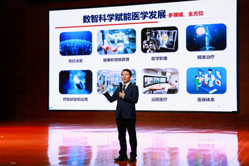 講座圍繞“科技創(chuàng)新”與“醫(yī)學人文”兩大維度展開。詹啟敏院士首先指出,新時代醫(yī)學使命已超越單純守護生命健康,延伸至保障國家安全、維護社會穩(wěn)定、促進經(jīng)濟發(fā)展的多維層面,而“全方位、全周期保障人民健康”的大健康理念,對醫(yī)學發(fā)展提出了更高要求。針對我國健康事業(yè)面臨的重大疾病高發(fā)、人口老齡化、創(chuàng)新能力不足等挑戰(zhàn),他呼吁以“四個面向”為指引驅(qū)動醫(yī)學創(chuàng)新。他強調(diào),數(shù)智科學的賦能為破解現(xiàn)代醫(yī)學“數(shù)據(jù)割裂、分析低效、應(yīng)用粗放”的瓶頸提供了關(guān)鍵支撐,目前已廣泛覆蓋基礎(chǔ)研究、藥物創(chuàng)新、人群隊列研究、臨床診療等全領(lǐng)域,而構(gòu)建科學的AI治理體系則是技術(shù)規(guī)范發(fā)展的重要保障。