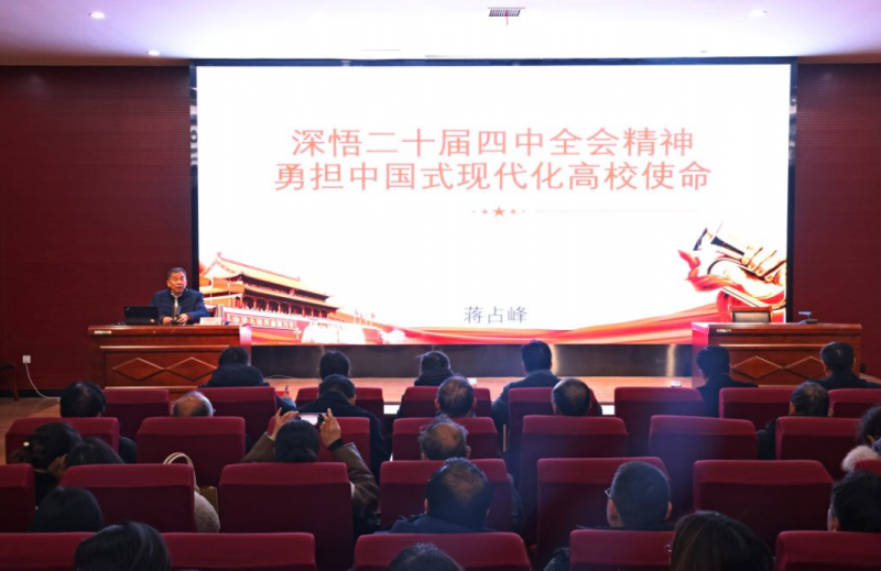 蔣占峰以“深悟黨的二十屆四中全會精神 勇?lián)袊浆F(xiàn)代化高校使命”為題,從“黨的二十屆四中全會召開的重大意義”“準確把握‘十五五’時期在基本實現(xiàn)社會主義現(xiàn)代化進程中的重要地位”“深刻領(lǐng)會‘十五五’時期經(jīng)濟社會發(fā)展的指導(dǎo)方針和主要目標”“全面理解‘十五五’時期經(jīng)濟社會發(fā)展的戰(zhàn)略任務(wù)和重大舉措”“堅持和加強黨的全面領(lǐng)導(dǎo) 凝聚起推進中國式現(xiàn)代化的磅礴力量”“學(xué)思踐悟凝共識 新工開啟新征程”六個方面,結(jié)合翔實數(shù)據(jù)與生動案例,對全會精神作了深刻闡釋和解讀。
