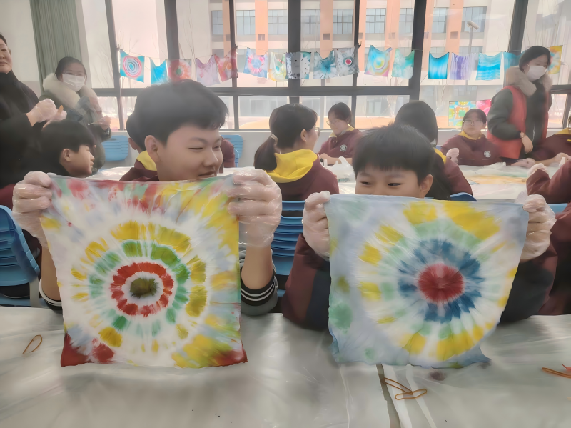 課程實(shí)施過程中,團(tuán)隊(duì)注重理論與實(shí)踐相結(jié)合,系統(tǒng)講授扎染技藝的歷史淵源與審美價(jià)值,并指導(dǎo)學(xué)生完成從設(shè)計(jì)、捆扎到染色、固色的完整創(chuàng)作流程。與此同時(shí),除了本次美育實(shí)踐教學(xué)之外,還協(xié)助黎陽中學(xué)正式建立了“扎染藝術(shù)”興趣小組,配備了基礎(chǔ)工具材料,制定了活動(dòng)方案與教學(xué)計(jì)劃,為學(xué)生掌握美術(shù)特長、提升審美能力奠定了基礎(chǔ)。