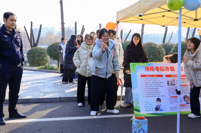 八大主題攤位各具特色,趣味與實用兼?zhèn)洌尠踩逃肽X入心。在消防安全區(qū),平原示范區(qū)消防大隊的李青等教官現場指導,學生們親手穿戴消防服、防毒面具,沉浸式感受消防員的日常工作;交通安全區(qū)別出心裁設置呼氣式酒精測試實驗,直觀展現食品對酒精檢測結果的影響,搭配“交通飛行棋”游戲,讓交通規(guī)則在趣味互動中深入人心;網絡安全區(qū)將傳統投壺游戲與防詐騙問答相結合,學生們在投壺競技的同時,輕松掌握識別“刷單返利”“冒充客服”等騙局的技巧;防暴恐安全區(qū)里,警務教官現場演示防護器械使用方法,手把手教學提升學生應急自衛(wèi)能力。