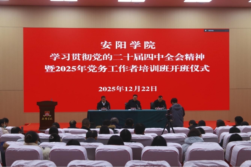 為深入學(xué)習(xí)貫徹黨的二十屆四中全會精神,全面提升黨務(wù)工作者隊伍的政治素養(yǎng)與業(yè)務(wù)能力,12月22日下午,安陽學(xué)院學(xué)習(xí)貫徹黨的二十屆四中全會精神暨2025年黨務(wù)工作者培訓(xùn)班開班儀式在綜合樓報告廳順利舉行。黨委書記孟偉出席開班儀式,原陽校區(qū)同步設(shè)立分會場,原陽校區(qū)黨工委書記、副校長馬保建在分會場出席儀式。職能部門負責(zé)人和兩校區(qū)基層黨組織黨務(wù)工作者代表參加儀式。會議由黨委副書記、副校長張宇主持。