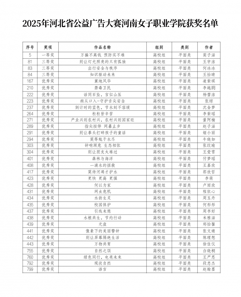 近日,河北省公益廣告大賽評選結(jié)果正式揭曉,河南女子職業(yè)學(xué)院美術(shù)與設(shè)計(jì)學(xué)院師生憑借扎實(shí)的專業(yè)功底和創(chuàng)新的設(shè)計(jì)理念,一舉斬獲34項(xiàng)獎項(xiàng),其中1件作品憑借深刻的立意與精良的制作摘得一等獎,斬獲獎金1000元;3件作品榮獲三等獎,各獲獎金500元;另有30件作品獲評優(yōu)秀獎,同時學(xué)校獲得“優(yōu)秀組織單位”稱號。