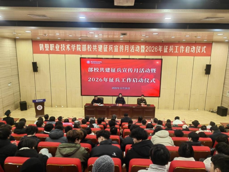 12月26日,鶴壁職業(yè)技術(shù)學(xué)院部校共建征兵宣傳月活動暨2026年征兵工作啟動儀式在學(xué)校誠信禮堂1號報告廳舉行。學(xué)校黨委副書記趙勇、鶴山區(qū)人武部政委解曉鋒出席儀式。黨委委員、副院長杜永慶主持儀式。武裝部負(fù)責(zé)人、各二級學(xué)院黨總支負(fù)責(zé)人、輔導(dǎo)員代表、大學(xué)生軍事協(xié)會代表及學(xué)生代表200余人參加。