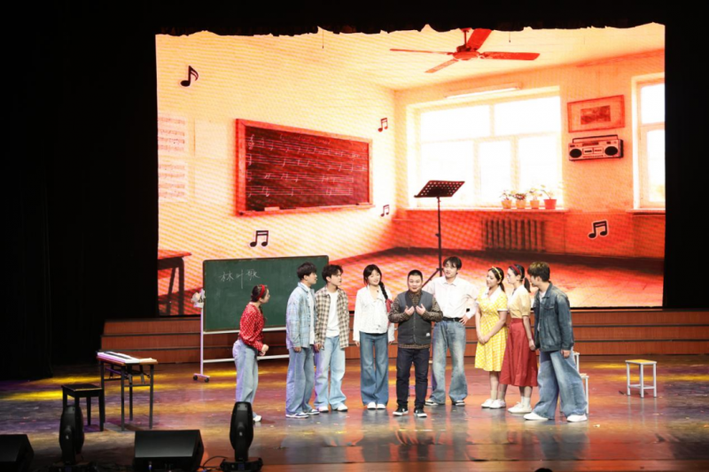 演出在三聲鐘響與悠揚(yáng)提琴聲中拉開序幕,“序?時(shí)光初見”篇章里,四位教師站在舞臺(tái)不同方位,以跨越時(shí)空的對(duì)話勾勒出教育生涯的關(guān)鍵瞬間——初登講臺(tái)的忐忑、送走首屆畢業(yè)生的不舍、見證學(xué)生成長(zhǎng)的欣慰、即將退休的眷戀。“時(shí)光初見,弦歌未央”的齊聲告白,道出了教育工作者對(duì)初心的堅(jiān)守,也為整場(chǎng)演出奠定了溫情而厚重的基調(diào)。隨后,合唱《校園里有一排年輕的白楊》旋律響起,將觀眾帶入那段青澀而熾熱的教育初程。