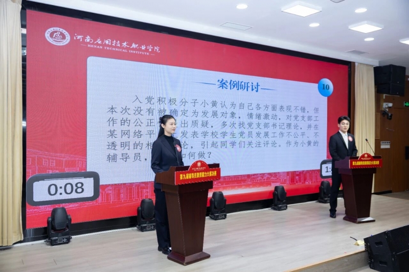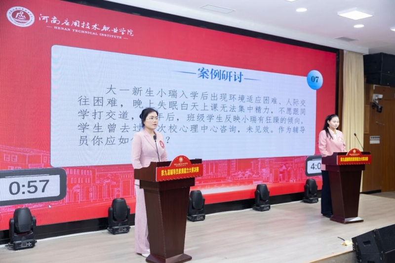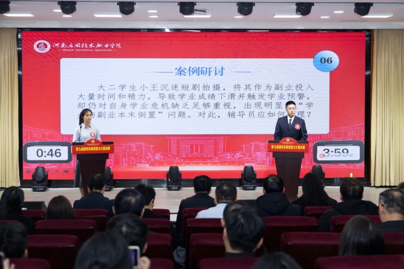 1月7日下午,河南應(yīng)用技術(shù)職業(yè)學(xué)院第九屆輔導(dǎo)員素質(zhì)能力大賽決賽舉辦。校黨委書記閆俊山、河南省教育廳思想政治工作處相關(guān)負(fù)責(zé)同志、副校長黃振中親臨指導(dǎo),相關(guān)部門負(fù)責(zé)人,各二級學(xué)院黨總支書記、副書記及全體專兼職輔導(dǎo)員到場觀摩。