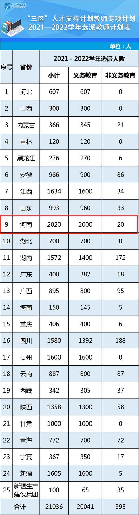 河南省計(jì)劃選派2020名教師,其中義務(wù)教育階段計(jì)劃選派2000名,非義務(wù)教育階段20名。
