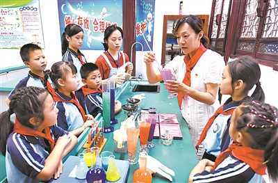 7月13日,安徽省安慶師范大學(xué)學(xué)生志愿者走進(jìn)迎江區(qū)依澤小學(xué),在科學(xué)實(shí)驗(yàn)室里與孩子們一起體驗(yàn)科技的神奇。黃有安 王佳 攝