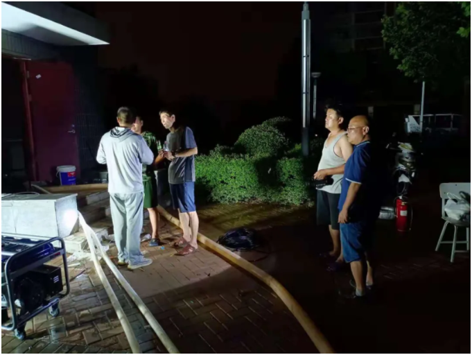 23日上午,鄭州幼專校領(lǐng)導(dǎo)在得知鄭開大道自東往西的道路可以到達(dá)學(xué)校的消息后,第一時間趕赴象湖校區(qū),同時帶去了食物、飲水、發(fā)電機(jī)、抽水泵等物資。張小勇等同志吃完飯又馬不停蹄地組裝發(fā)電機(jī)給學(xué)術(shù)交流中心地下室抽水。此時此刻,三臺水泵正在連夜工作,在值班中層干部任世卿、翟金成、麻新旗及所有搶險同志的努力下,地下室水位已下降1米左右,爭取能夠早日恢復(fù)供電。