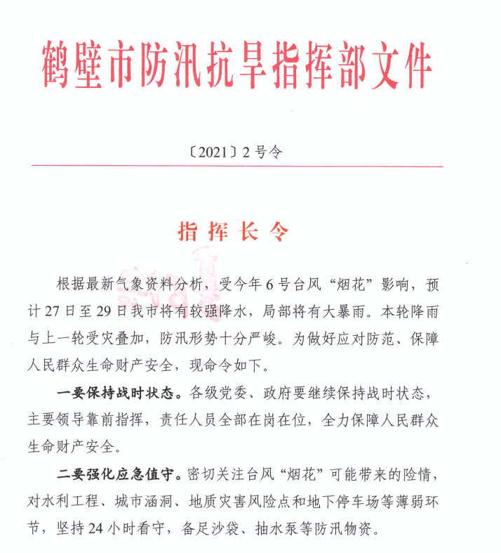鶴壁市防汛抗旱指揮部發(fā)布指揮長2號令