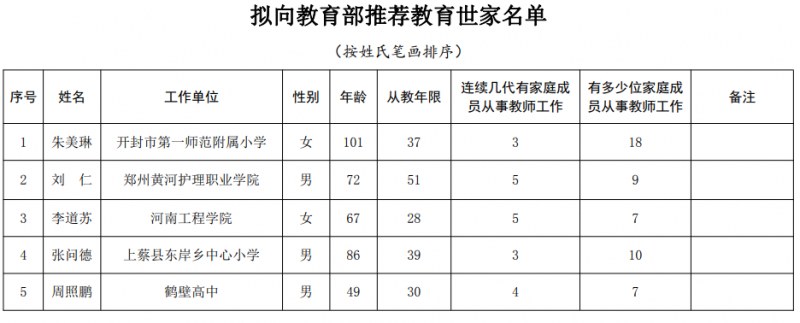 根據(jù)《教育部辦公廳關(guān)于開(kāi)展首批教育世家學(xué)習(xí)宣傳活動(dòng)的通知》(教師廳函〔2021〕13號(hào))和《河南省教育廳關(guān)于開(kāi)展首批教育世家學(xué)習(xí)宣傳活動(dòng)的通知》(教師函〔2021〕430號(hào))精神,經(jīng)個(gè)人申報(bào)、單位推薦、專家評(píng)審等程序,擬向教育部推薦開(kāi)封市第一師范附屬小學(xué)朱美琳等5個(gè)教育世家參加全國(guó)首批教育世家審核認(rèn)定,擬審核認(rèn)定河南師范大學(xué)王軍等50個(gè)教育世家為河南省首批教育世家,現(xiàn)將結(jié)果予以公示。