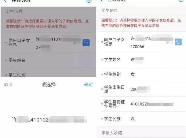 選擇同戶口子女信息下拉框中需要辦理入學申請的子女信息,并點擊右側(cè)藍色按鈕獲取子女相關(guān)信息(此過程將校驗所選子女是否符合入學年齡、是否已經(jīng)報名)。