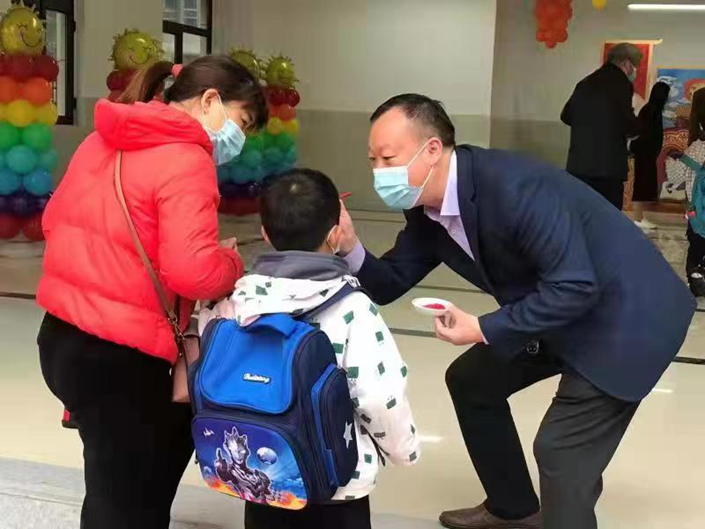 上午八時許,校園里響起了陣陣典雅的禮樂,家長們和孩子們有序入場。萌娃們牽著家長的手,踩著學校專門貼心設(shè)計的“愛心通道”,來到歡迎墻前拍照留念,行“立身啟智”、“擊鼓明志”禮,擊鼓明志、大聲說出自己的志向,并通過園丁們的指引,快速找到自己所在的班集體。學校領(lǐng)導周智超等在孩子們的眉心點上朱砂,寓意開啟智慧大門,祝福孩子們在校園里努力學習、快樂成長、越來越聰明,給孩子們帶來了幸福、甜美的啟蒙體驗。