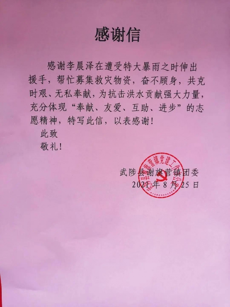 7月25日,團(tuán)省委緊急征集志愿者,一批愛(ài)心物資要運(yùn)送焦作武陟受災(zāi)一線,得知情況后,李晨澤二話不說(shuō),主動(dòng)報(bào)名,當(dāng)天下午在團(tuán)省委門前協(xié)助裝車后,天色已晚,他和司機(jī)帶著水、方便面、面包等5噸物資出發(fā)了。因多處路況受損,高速難以順暢通行,司機(jī)幾經(jīng)轉(zhuǎn)彎繞道,于當(dāng)晚11點(diǎn)到達(dá)第一個(gè)捐贈(zèng)點(diǎn)嘉應(yīng)觀鄉(xiāng),“路上很顛簸,又困又餓又累,那么晚了村干部和村民還在村口等我們,真的很想哭,又感覺(jué)很自豪。”
